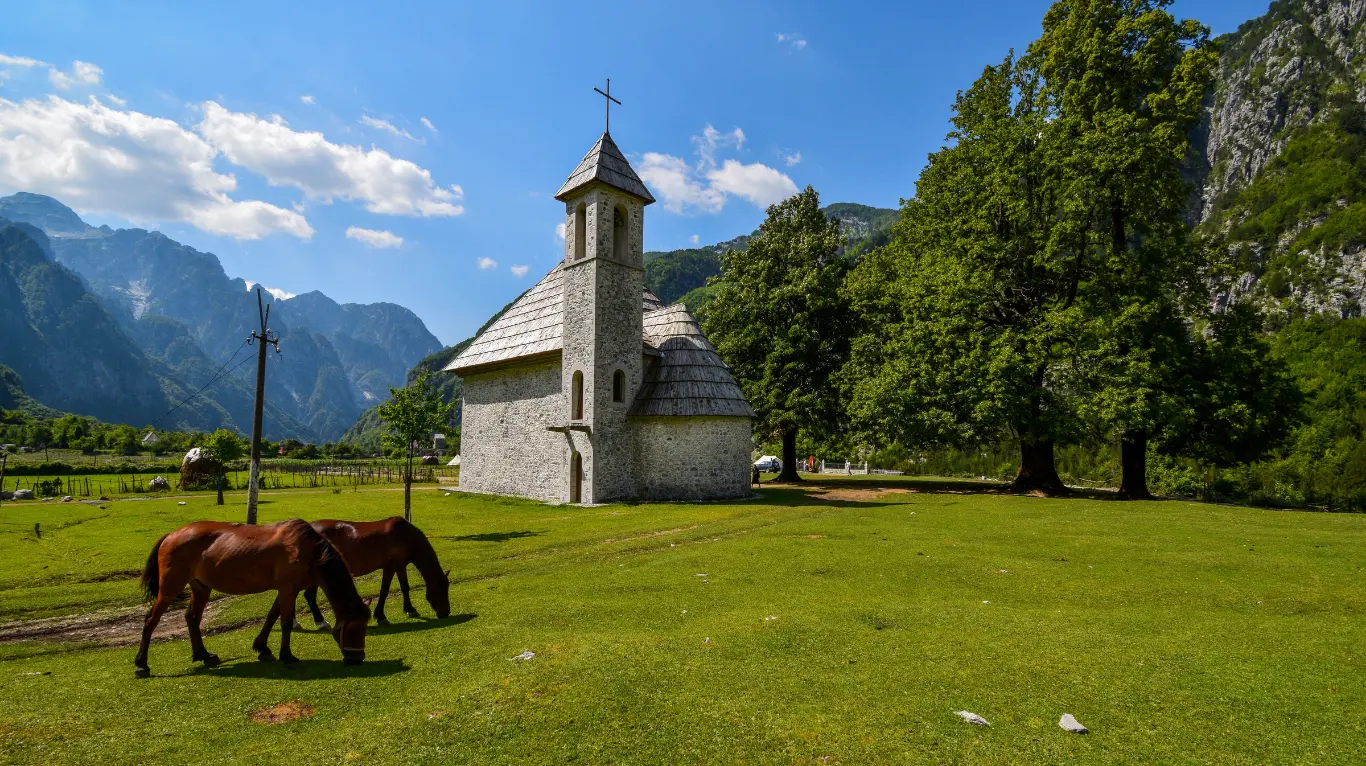 Today we journey into the emerald heart of the Albanian Alps. After a brief stop in the rural plains of Koplik, we ascend to the mythical village of Theth. Lunch is an authentic highland affair at a local mountain farm, featuring artisanal cheeses, hearth-baked bread, and traditional organic dishes. Spend the afternoon exploring the Lock-in Tower and the historic stone church, or take a gentle hike to the crystalline Grunas Waterfall to breathe in the pure mountain air.